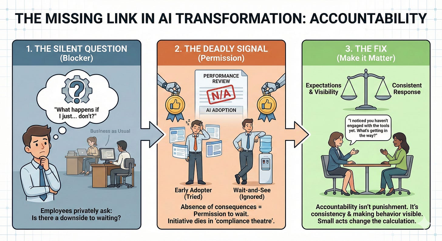 First, accountability feels punitive. Leaders want adoption to happen on its own, driven by enthusiasm rather than enforcement. Creating consequences feels heavy-handed, like you are forcing people to comply rather than inviting them to participate. Most leaders would rather inspire than enforce. So they avoid creating accountability structures, hoping that good communication and visible commitment will be enough.