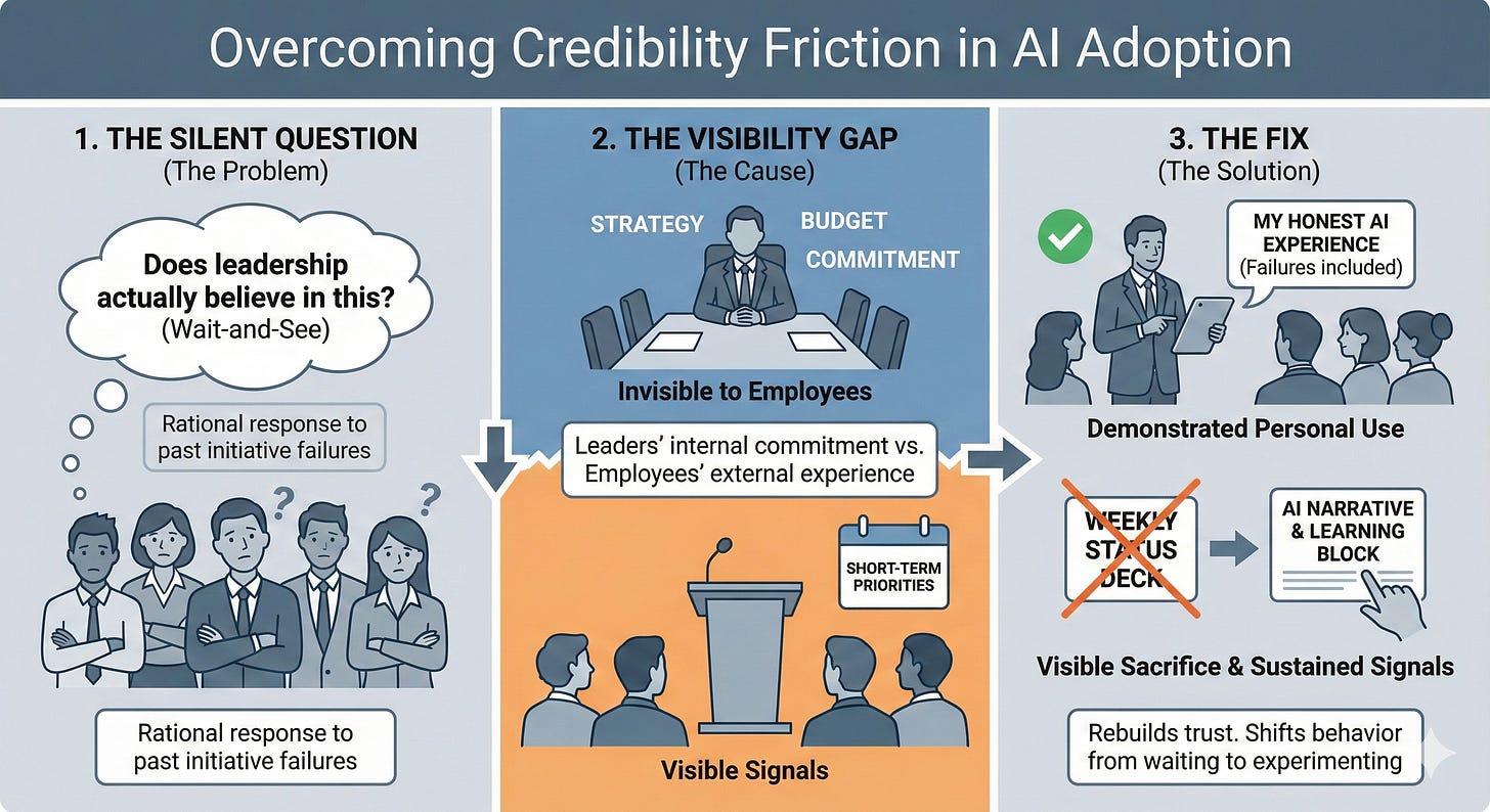 Employees experience your commitment from the outside. They see town halls where AI is mentioned but never demonstrated, mandates for others without visible adoption by the people making the mandates, and short-term priorities consistently winning when they conflict with the AI initiative.