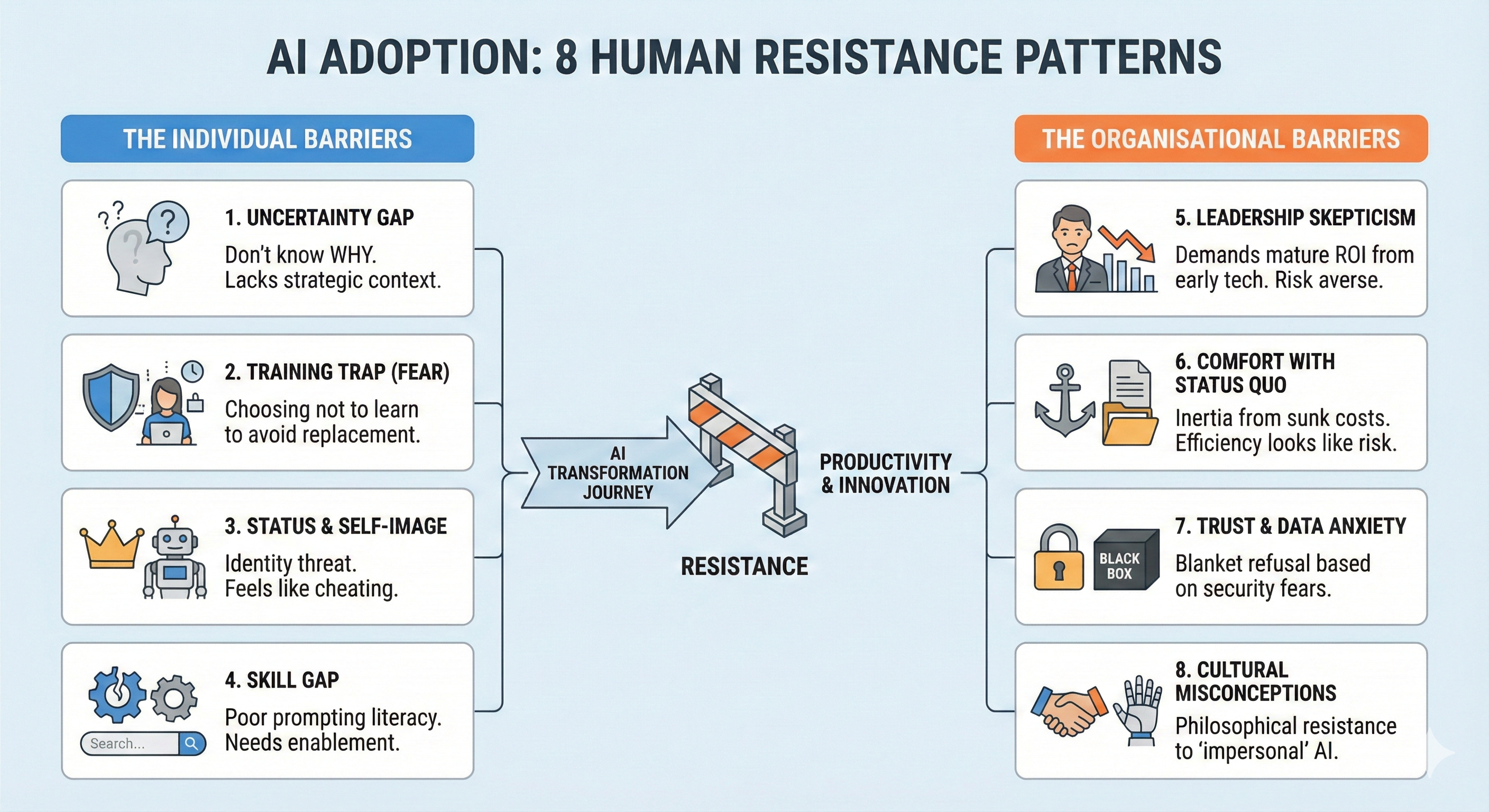 I have spent 12 years working on end-to-end project delivery in financial services. I have learned that technology adoption failures follow predictable patterns. The technology changes, but the human dynamics do not. These eight resistance patterns are not unique to AI. They are classic change management barriers wearing new clothes. While every organisation is unique, these are the common diagnostic categories visible across the industry.