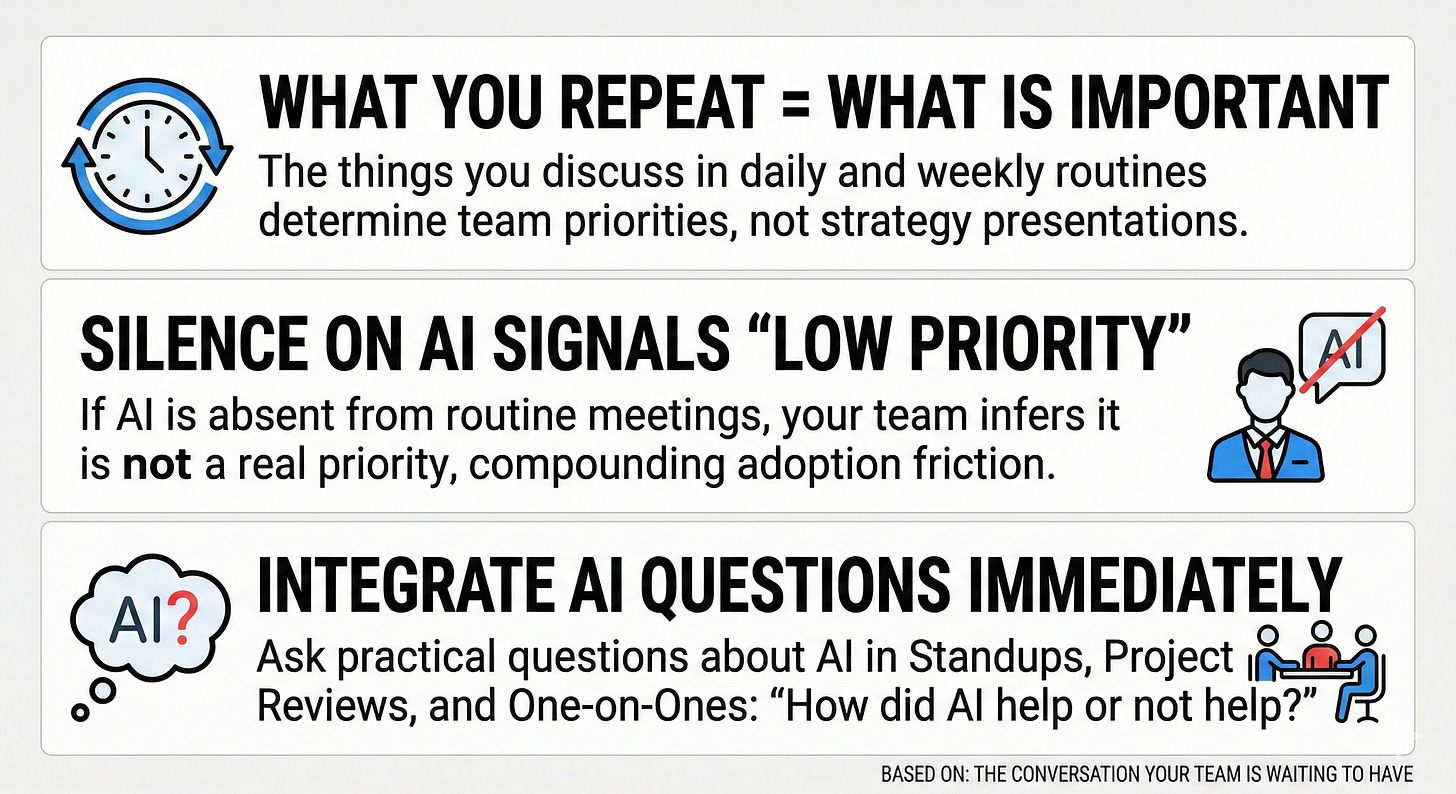 In my experience, the Monday meeting is where adoption lives or dies, not the quarterly review or the training session. The moment a manager does not mention AI in a routine meeting, the team receives a signal: this does not matter here. That signal compounds weekly.