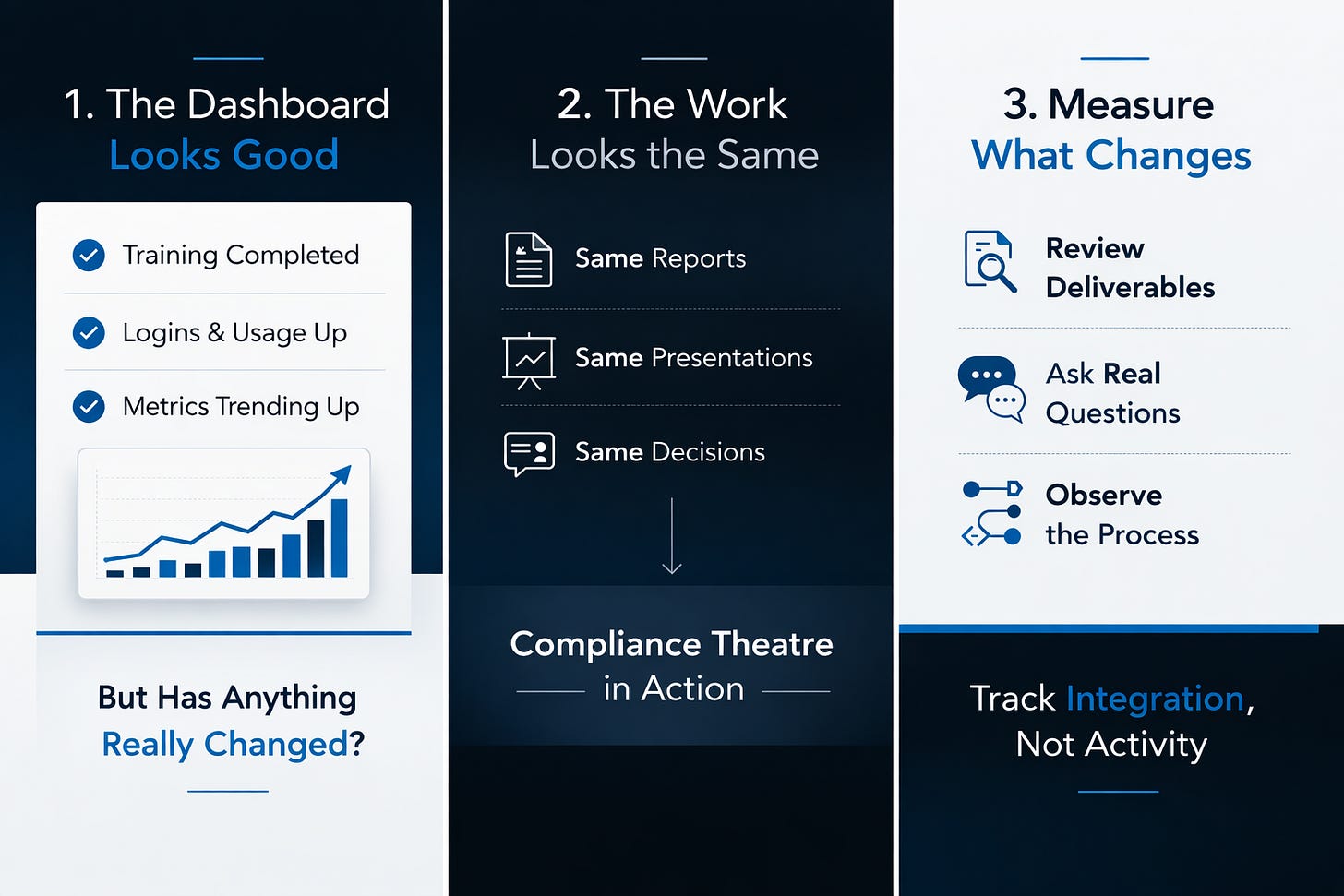 Compliance theatre is the hardest failure mode to diagnose. It produces the metrics leaders want to see. The dashboard trends upward. The training is complete. The team reports usage. But walk through the actual work products. Open the deliverables. Check the data sources. If the work is being produced the same way it was six months ago, the adoption is cosmetic. The metrics are measuring performance, not change.
