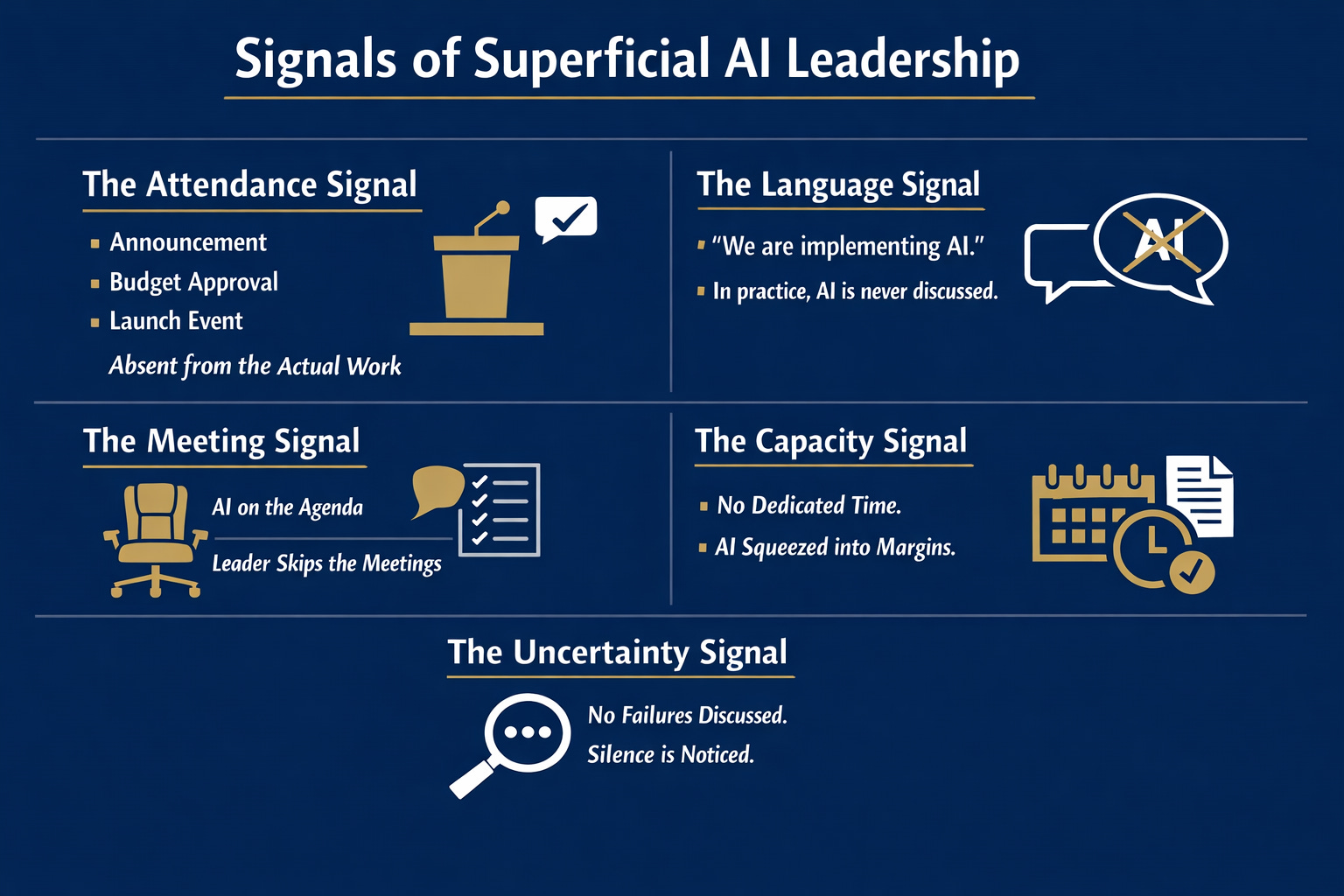 The Uncertainty Signal. No mention of a failure, a question, an experiment that did not work. Teams interpret silence as discomfort. If a leader were using AI tools, they would have something to say about it. The silence is the signal. And it is the hardest one to see in yourself, because the thing you are not doing feels like nothing. It is not nothing. It is a choice your team has already noticed.