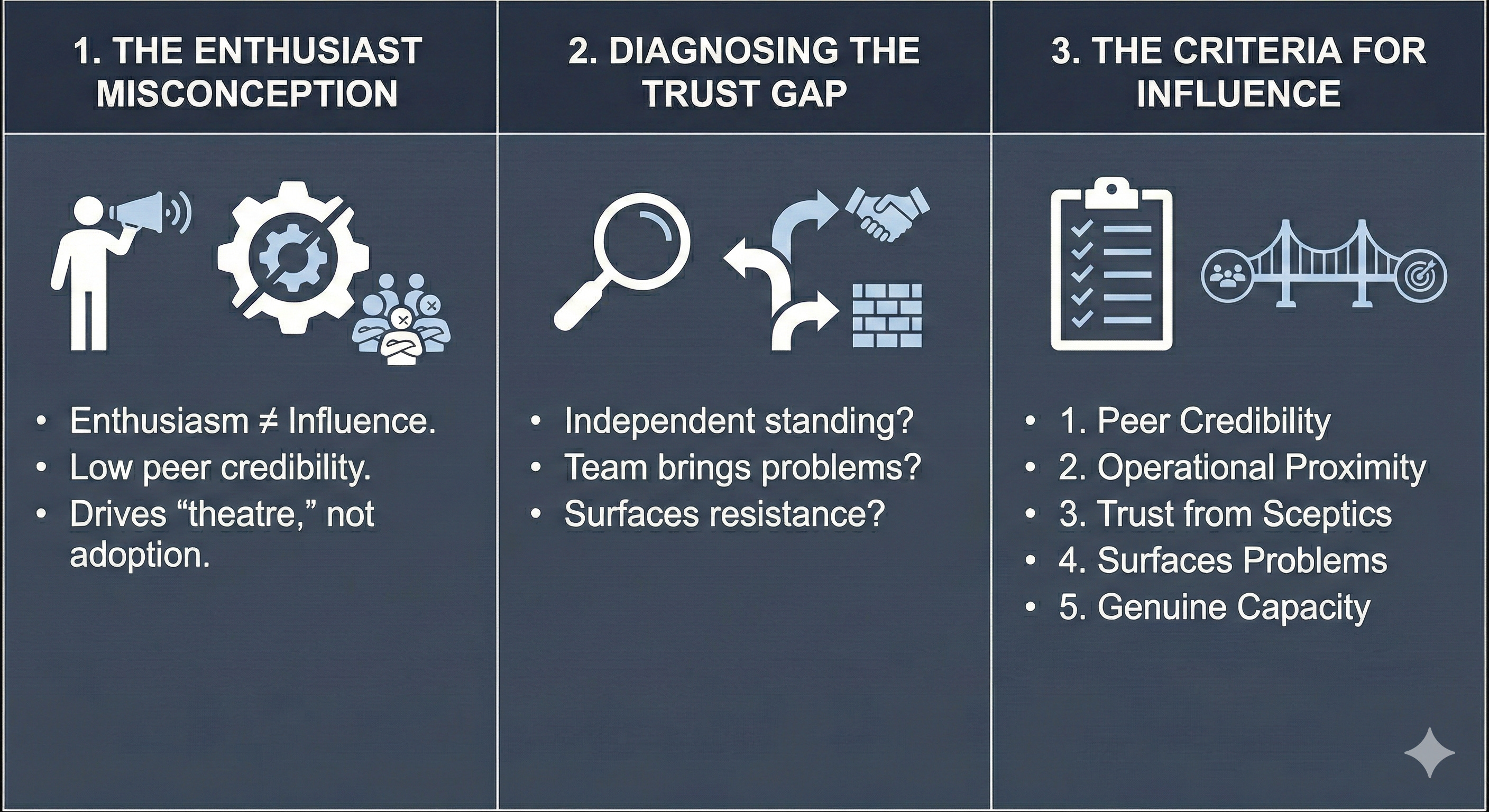Does the team bring problems to this person, or does this person bring solutions to the team? This is the direction of trust. Champions who push solutions without being asked are experienced as salespeople, not colleagues. The people who drive genuine adoption are the ones others already go to when something is not working.
