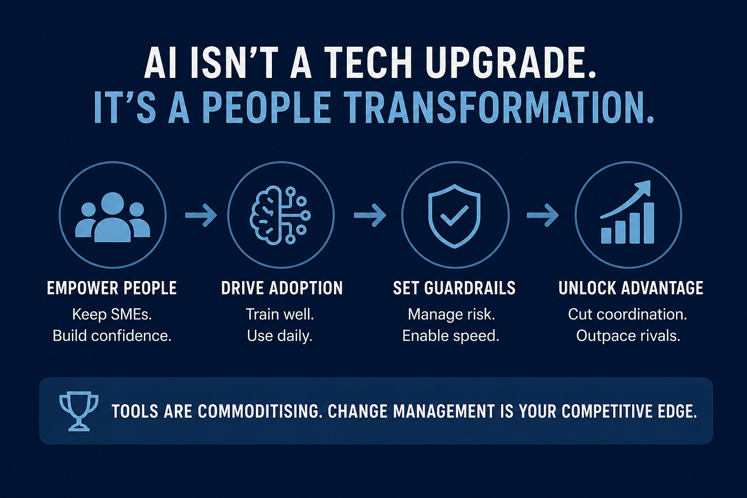 How is that turning out so far? It turns out many barriers to getting results from AI have nothing to do with the technology itself. It is all about the people and culture within the organisation trying to roll out an AI transformation. Many processes, controls, and ways of doing things that worked well in the pre-AI era are anti-patterns or obstacles in the moment we now find ourselves in. This means a proportion of AI projects are essentially doomed from inception.